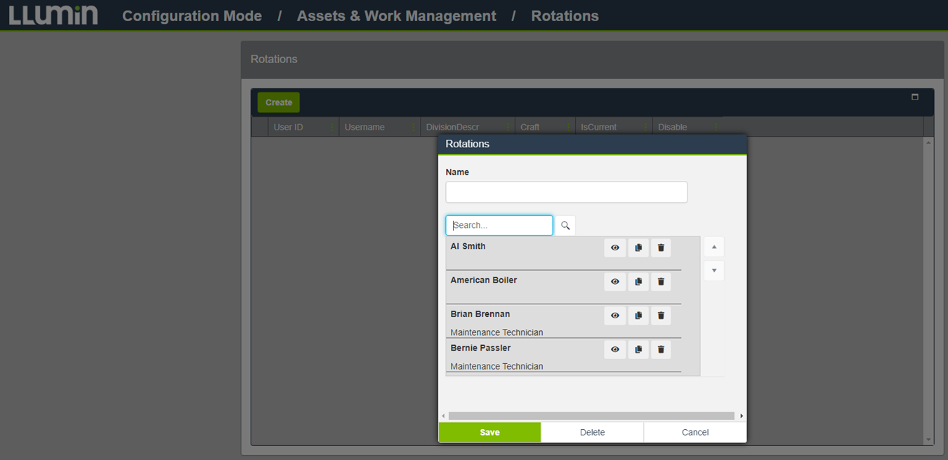 - Once the users have been added to the Rotation, three buttons will also be shown. The eye button will skip the user when click (eye will change to have a strike-through), the middle button will copy the user to the line below, and the trashcan icon will remove that user from the Rotation. To move users within the Rotation, simply click and drag the user’s name to the new order.