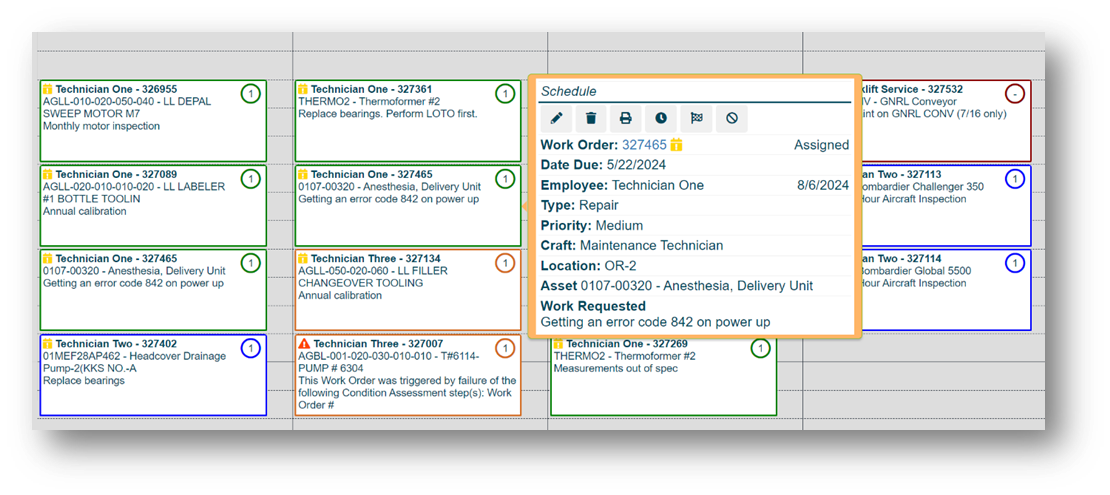 - Hover over a Work Order on the calendar to view the Schedule details, such as personnel, schedule date, estimated hours, and priority number.