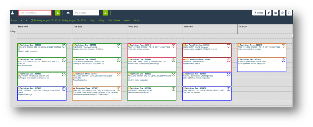 - Select the specific personnel, such as Technician One, to display only the work orders assigned to them.