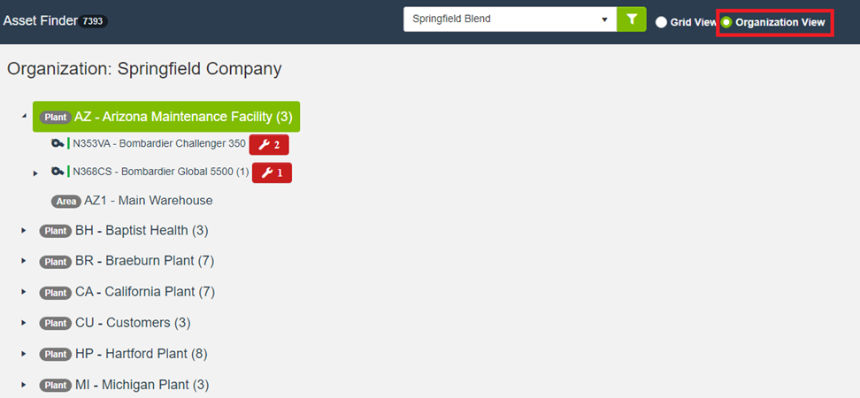 - To view assets in an organizational hierarchy, click the Organization View option near the top of the screen. This will display assets according to their hierarchy within the organization.