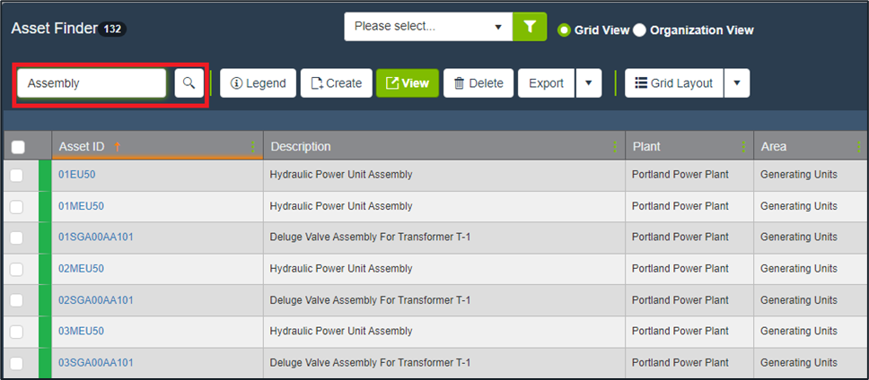 - In the Asset Finder, you can use the search bar to find assets by ID or Description.