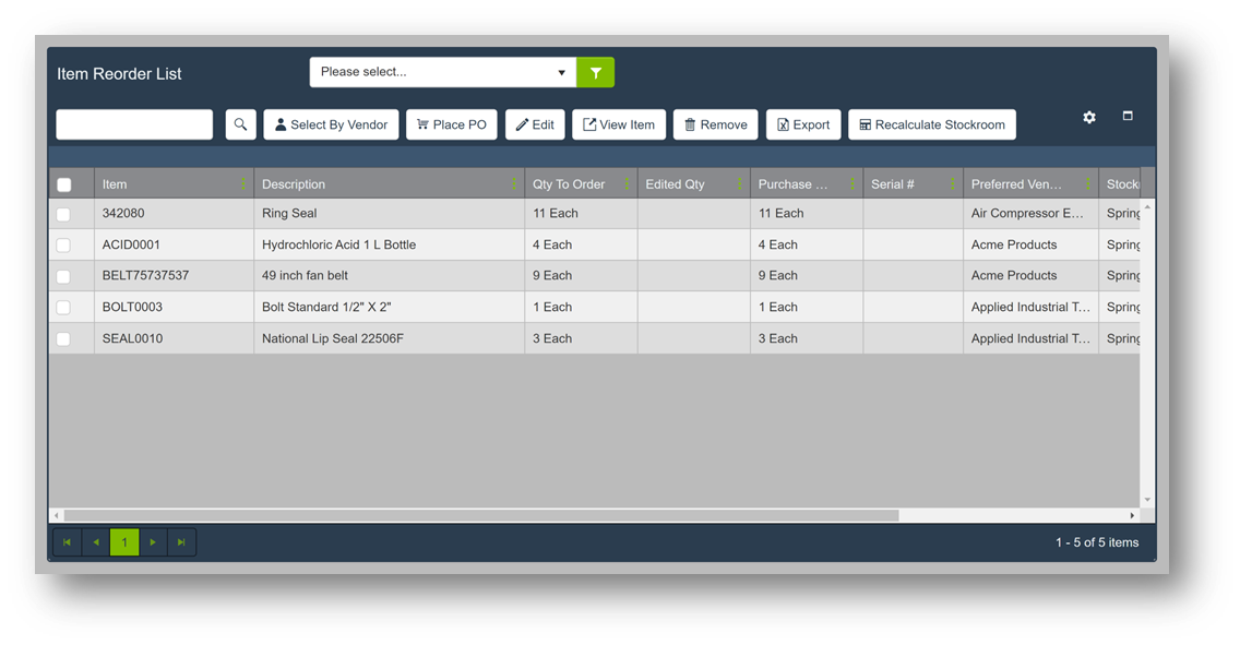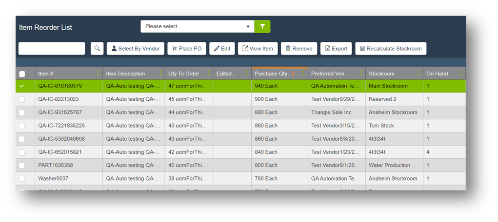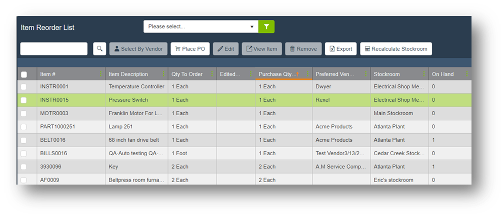 | Select by Vendor | Highlight all additional Reorders that have the same Preferred Vendor as the selected Reorder. |
