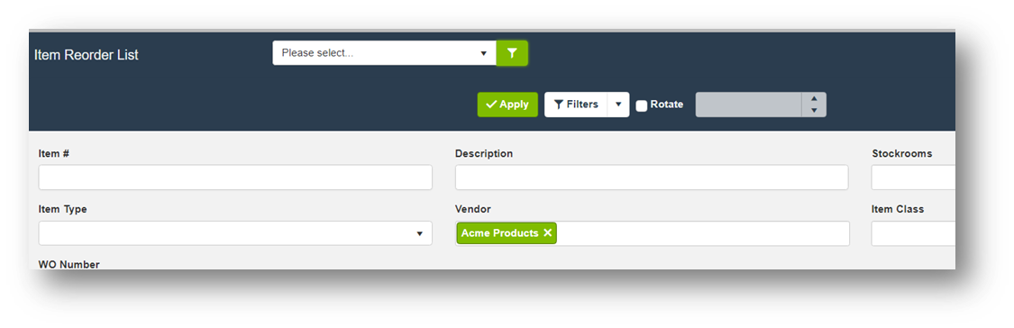 - Filters allow you to narrow down the Item Reorder List based on specific criteria. For instance, you can filter by Vendor, Stockroom, or Reorder Point to view only relevant items.