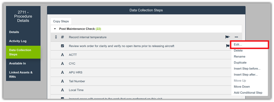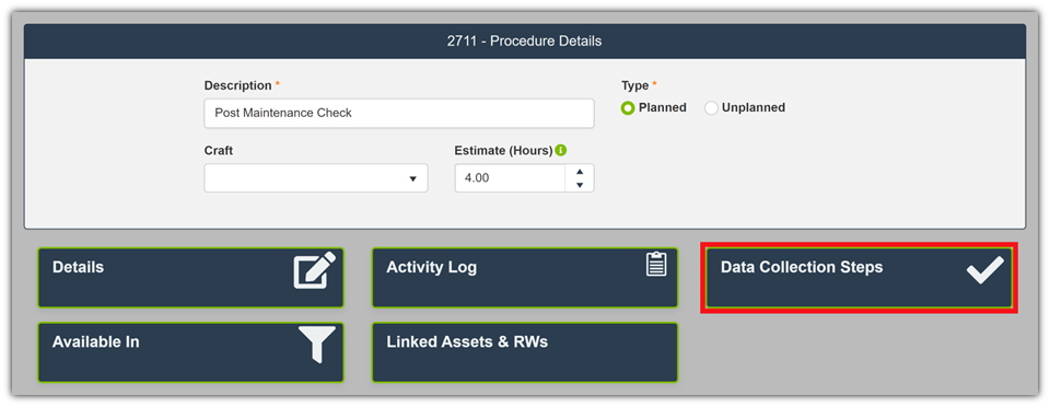 - Once you have opened a Procedure / TPM, select the Data Collection Steps button.