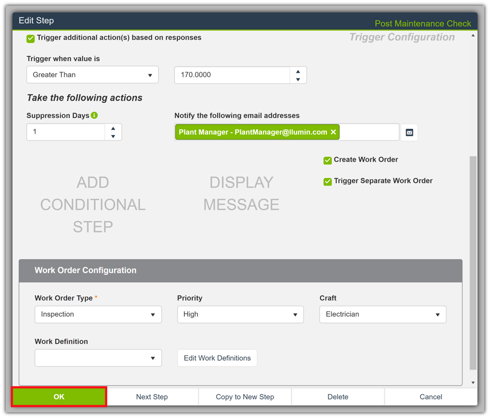 - Select OK to finish the Trigger Configuration and update / create the step.