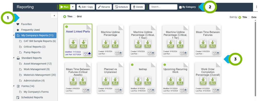 | 1 | Report Tiles / Grid | Change the display settings by toggling between Tiles or Grid view. |