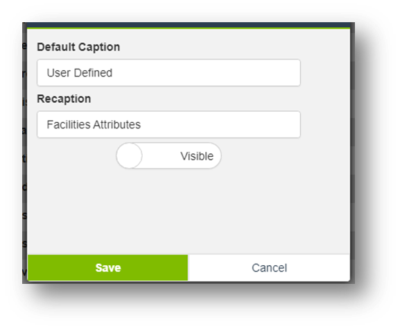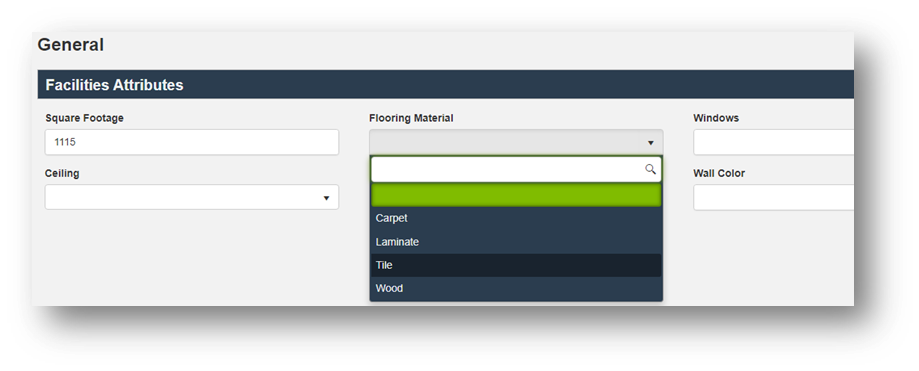 - Once saved, these dropdown options will appear under the recaptioned section (e.g., Facilities Attributes) in the General tab of associated assets.