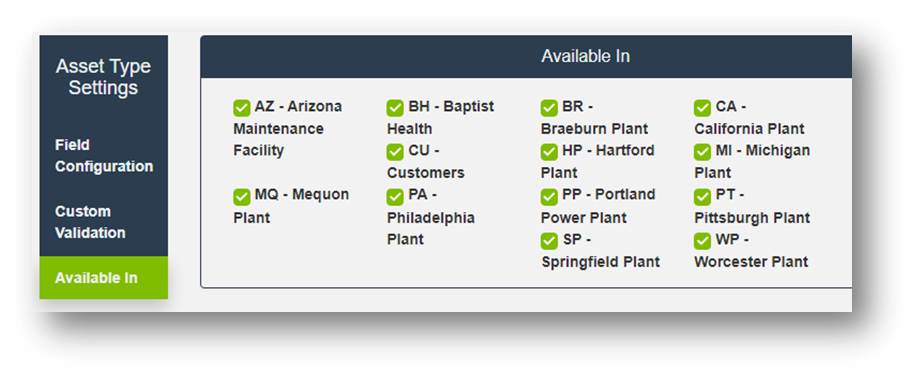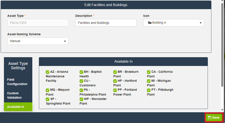 - Specify which locations the Asset Type is available in by selecting or deselecting locations in this menu.