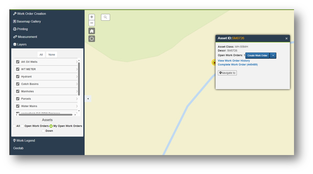 - Users can now easily filter work orders assigned to them by clicking the new "My Open Work Orders" button in the GIS Map View.