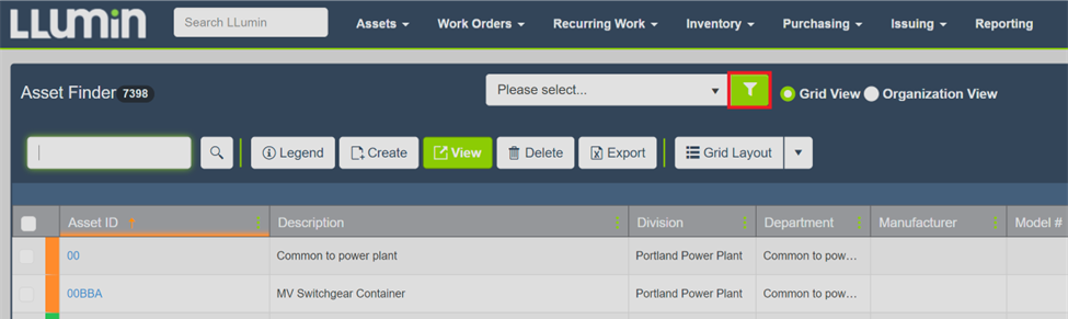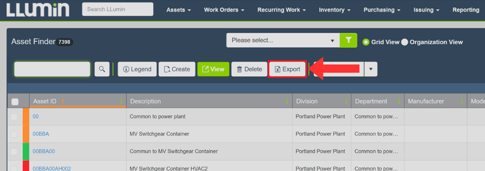 You can export lists of records from LLumin CMMS+ directly to Excel for offline analysis, reporting, or bulk processing. These steps apply to Assets, Work Orders, Purchase Orders, Inventory Items, and more.
