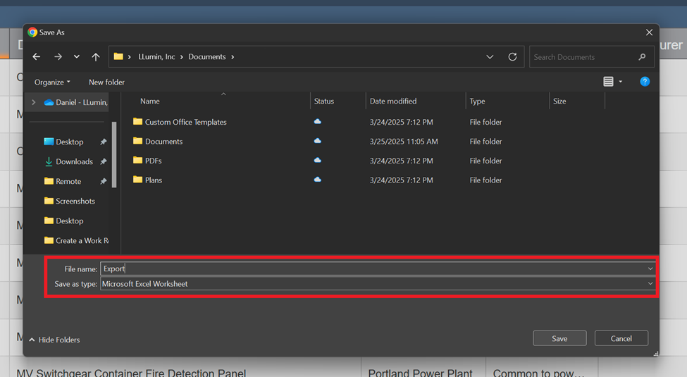 - LLumin will generate an Excel file containing the same records and columns as currently displayed.