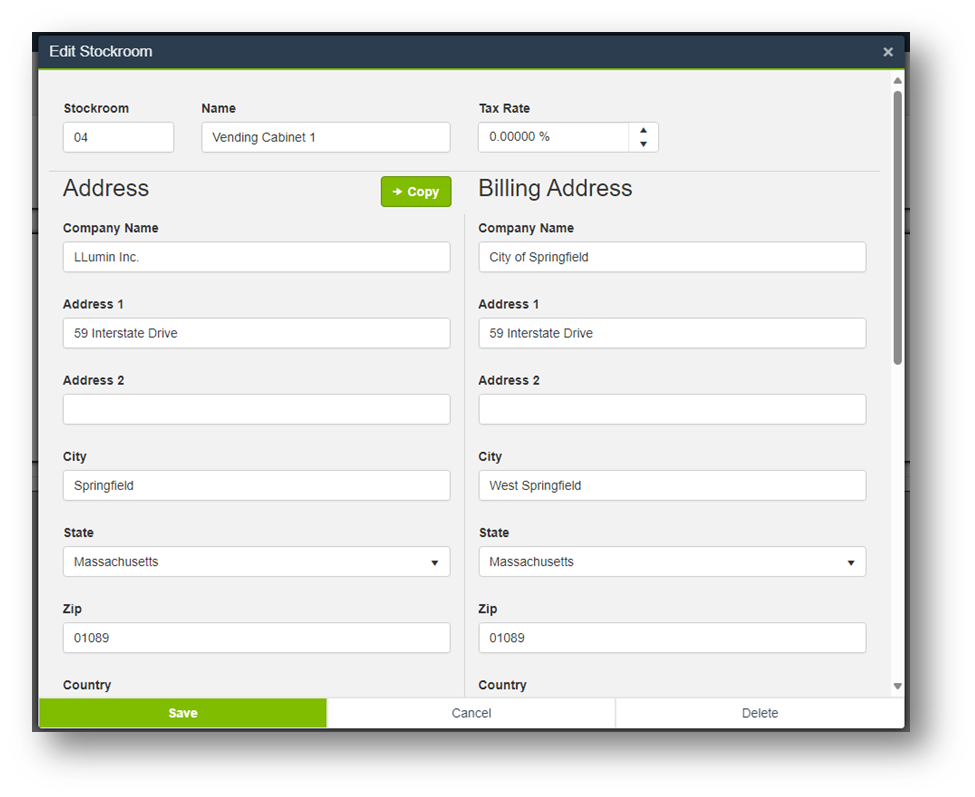 The Edit Stockroom dialog box will open. Here, you can update the address information or other important details, as shown below.