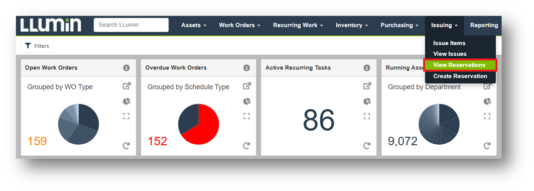 This article explains how you can use LLumin CMMS+ to create and view reservations from both Work Orders and Item records, issue reserved parts, and understand how reservations factor into the reorder process.