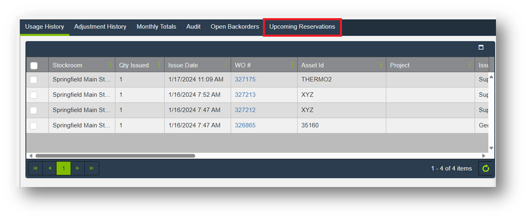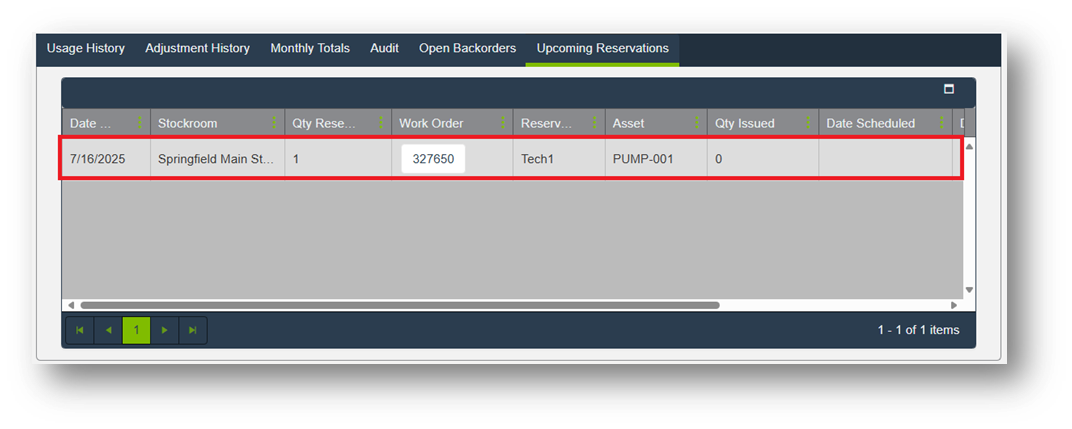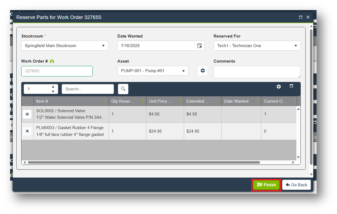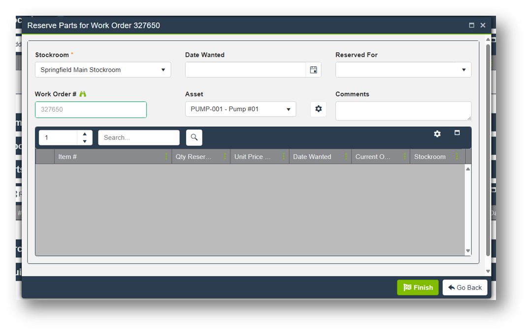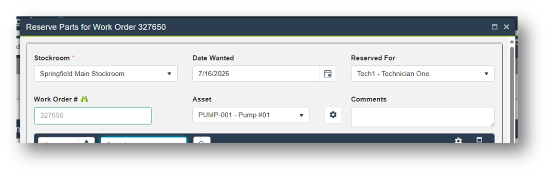 - Edit the Stockroom, Date Wanted, Reserved For (user), and associated Work Order.