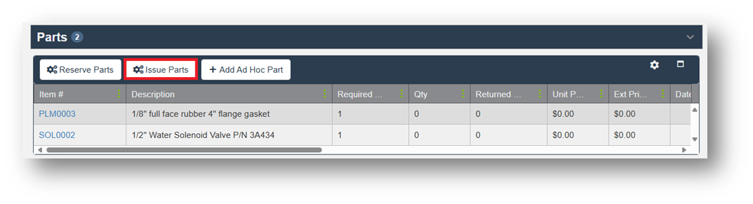 From the Parts tab on the Work Order Master screen or the toolbar at the bottom of the screen, select Issue Parts.