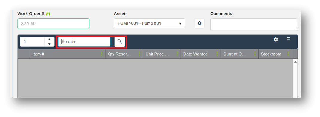 Use the Search bar to add parts to the issue. Before selecting a part, enter the required quantity in the field to the left of the search bar.