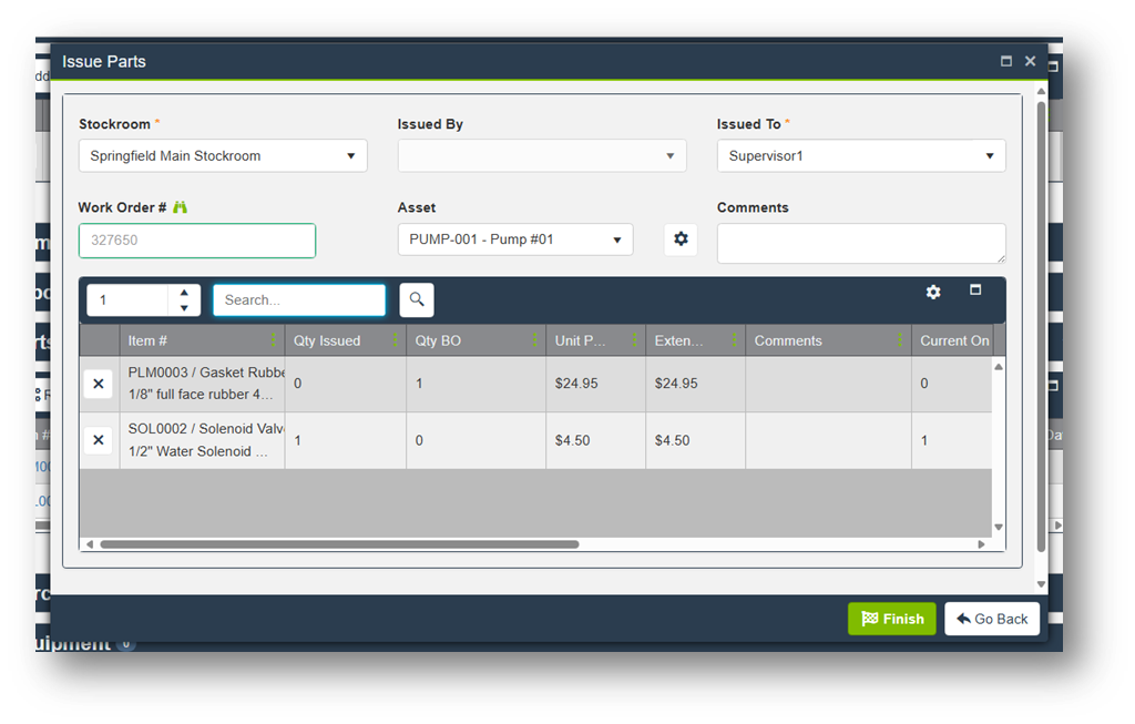 Note: If issuing parts would reduce stock below the reserved quantity, a warning appears. You can choose to continue, but the item will be flagged as out of stock.