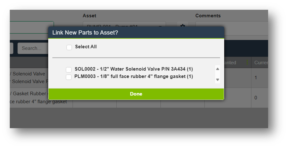 - After submission, a popup may appear asking if you want to link the new parts to the asset.