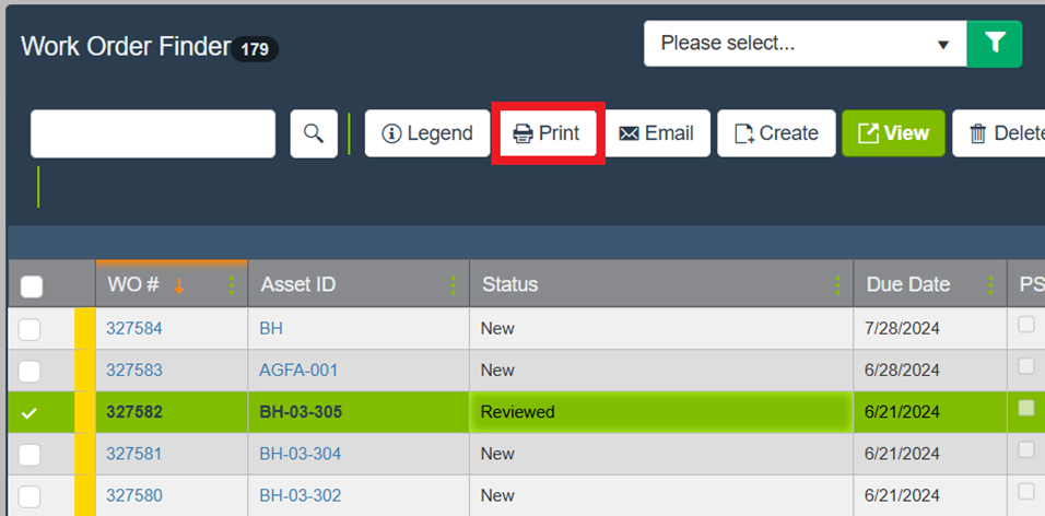 Print from the Work Order Finder