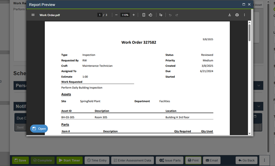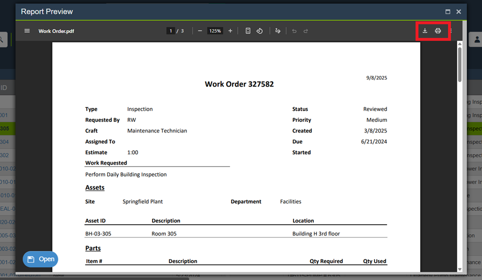 - A preview of the work order report will be generated.