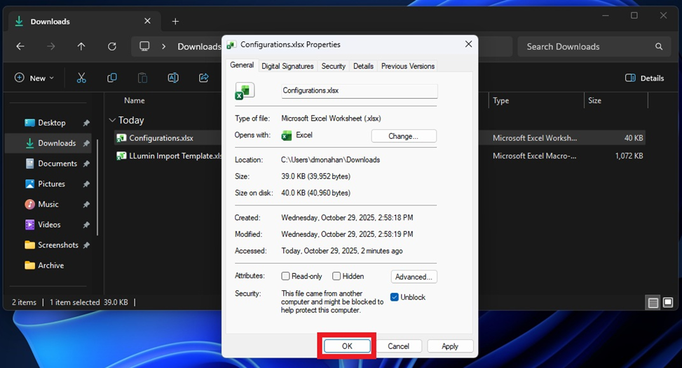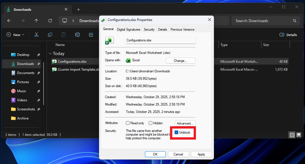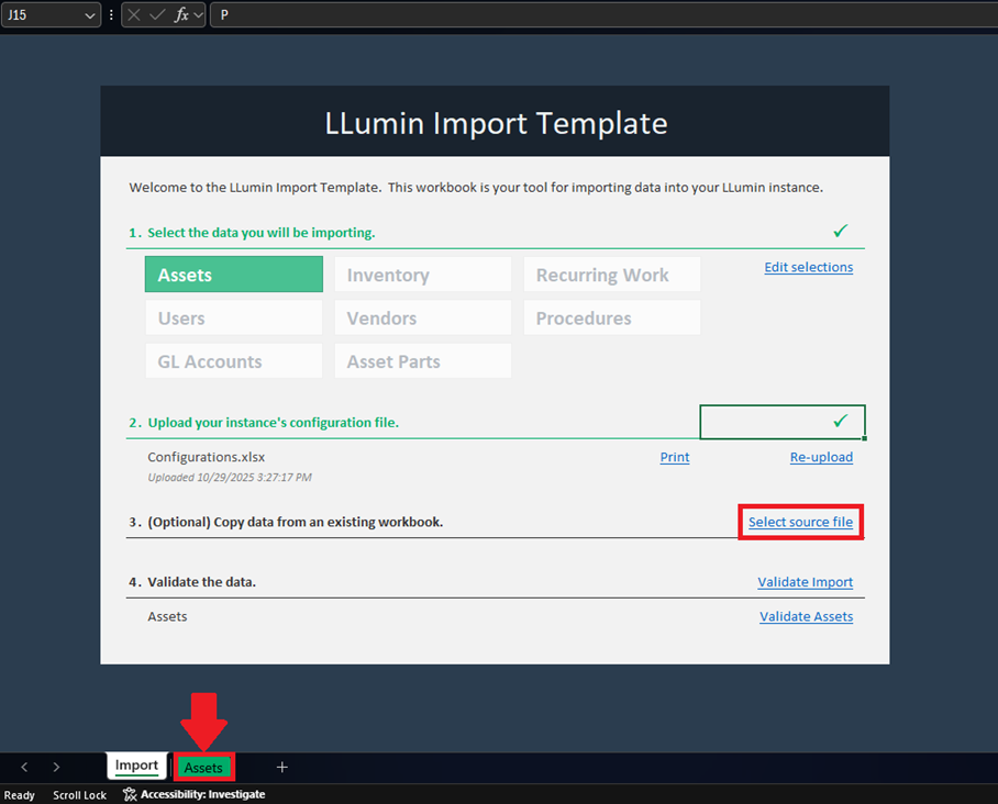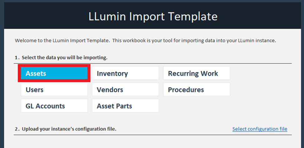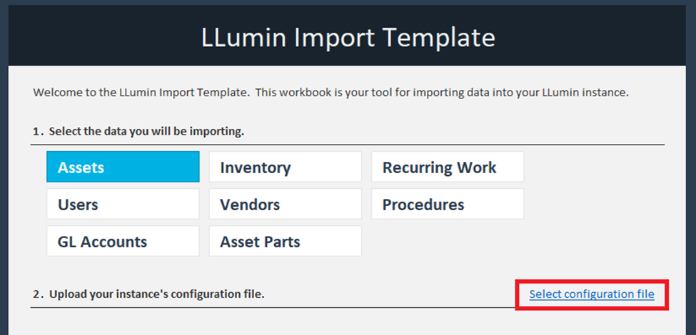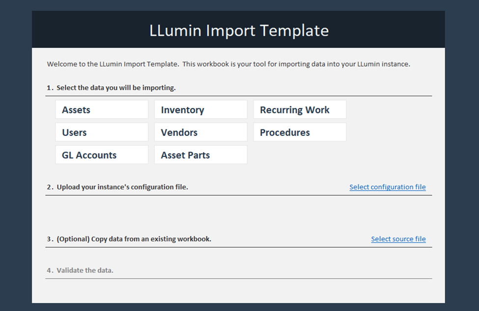 IMPORTANT: The LLumin Import Template uses macros. If your organization blocks macro-enabled spreadsheets, work with LLumin Support or your implementation consultant to complete the import.