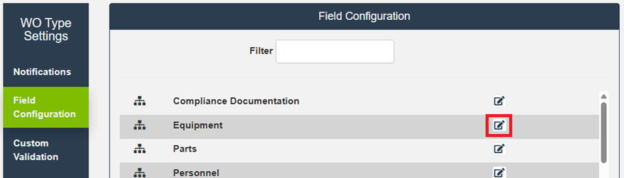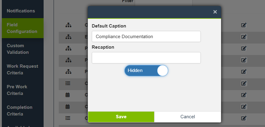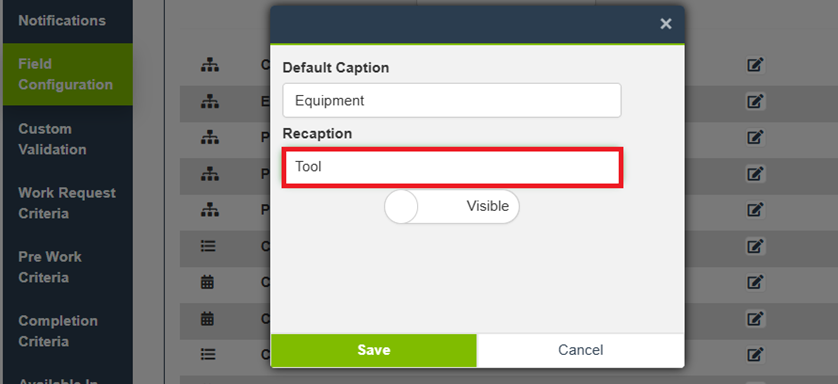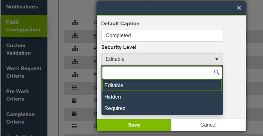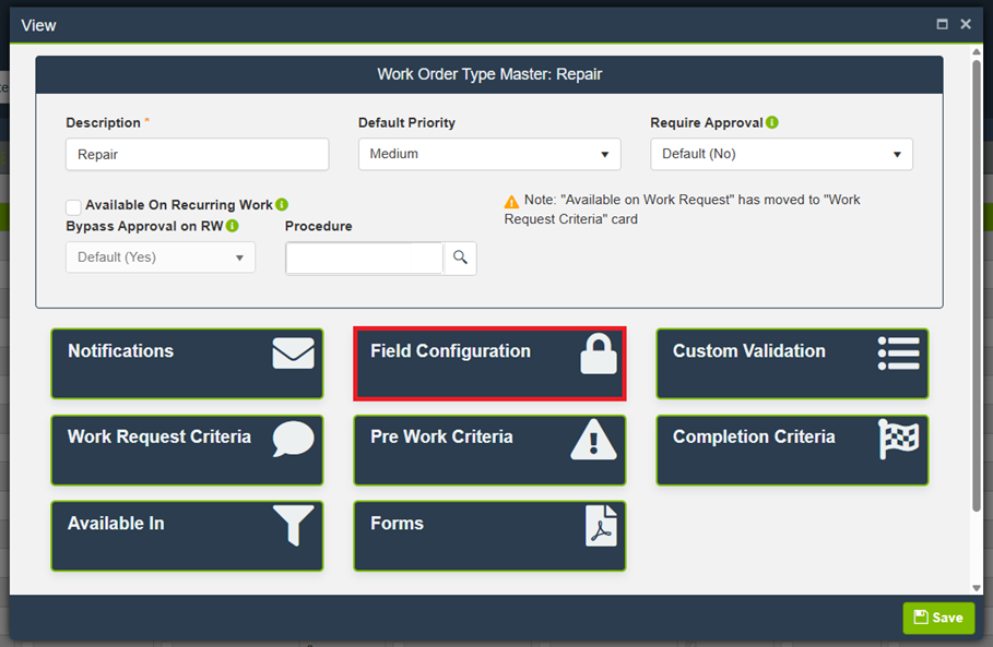 Field Configuration for a Work Order Type controls field captions, visibility, and whether fields are required. These settings apply to Work Orders created with that Type.