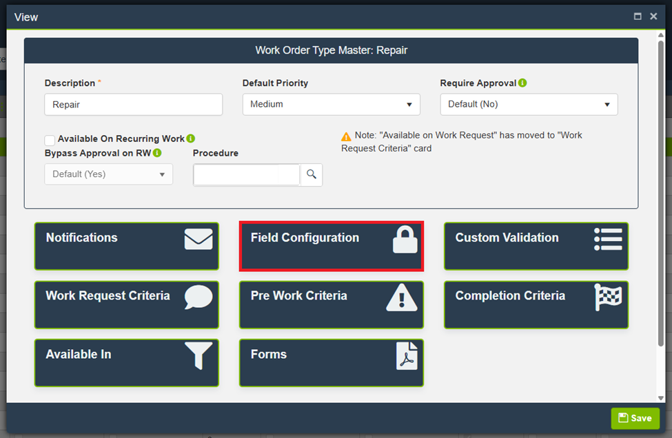 - Click Save to confirm changes to the work order type.