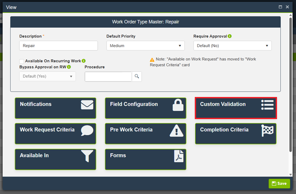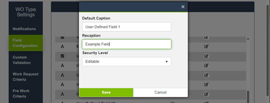 - Reopen the Work Order Type by selecting View again. This refreshes the available UDF list for validation.