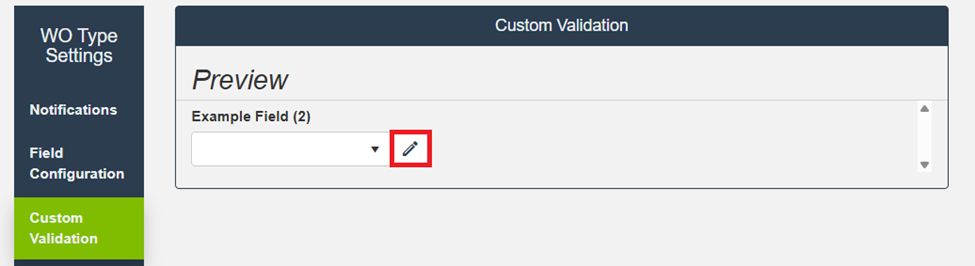 Custom Validation allows you to define a set of allowable values for a User Defined Field (UDF). After validation values are created, the field appears as a dropdown list when completing a Work Order of that Type.