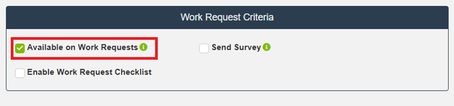 Work Request Criteria determine whether a Work Order Type is available on Work Requests and whether surveys or checklists are required when a request is submitted.