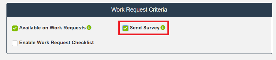 To send a satisfaction survey when Work Orders of this Type are completed, select Send Survey. This option is only available when the Type is enabled for Work Requests.