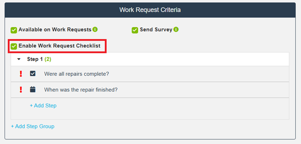 To require requesters to complete a checklist, select Enable Work Request Checklist.