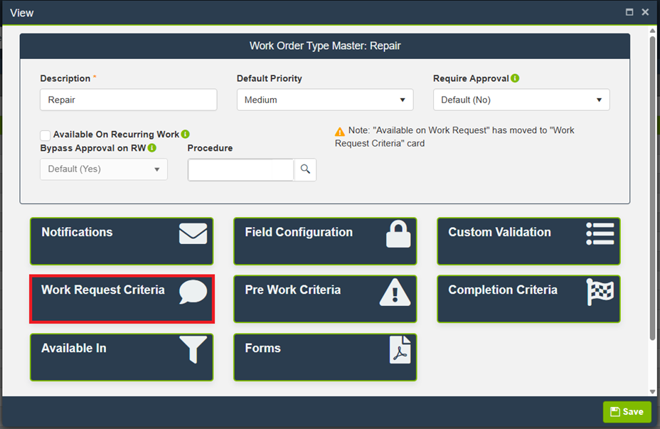 Work Request Criteria for this Work Order Type are now configured.