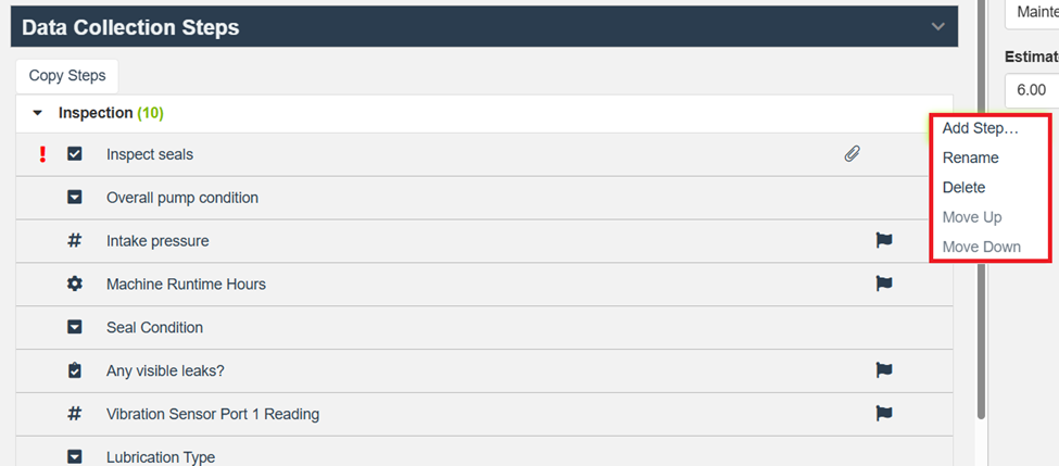 Data Collection (also called Condition Assessment) steps are used to capture structured information during task execution. These steps can appear in many areas of LLumin CMMS+. These steps guide users through inspections, measurements, confirmations, and other required inputs to ensure consistent and accurate data capture.