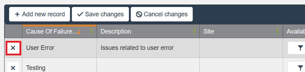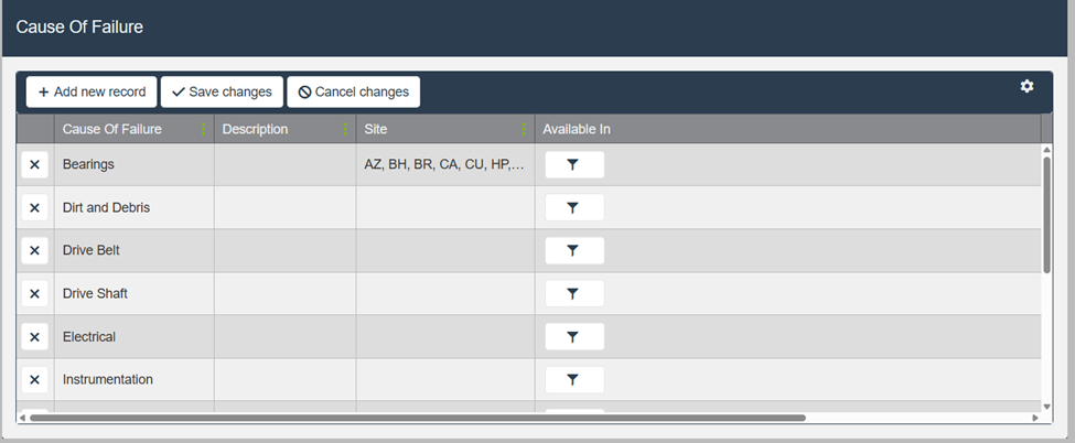 Administrators can add, remove, and assign availability for each Cause of Failure.