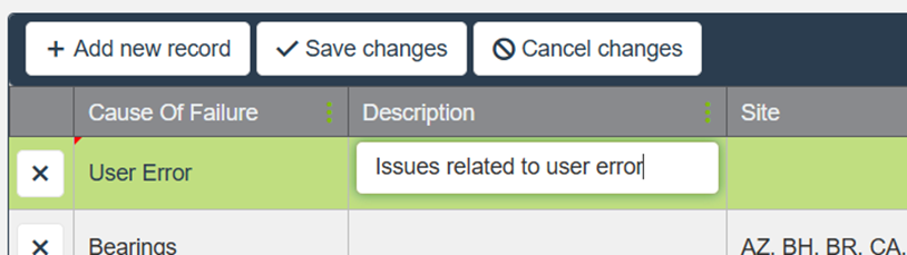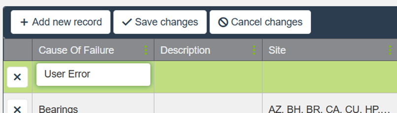 a Cause of Failure name (for example, “Electrical,” “User Error,” or “Mechanical Failure”).