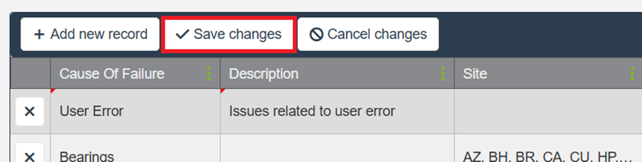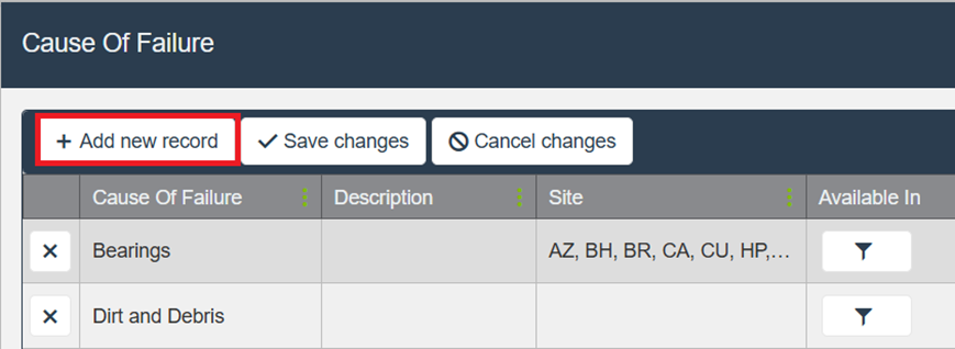 On the Causes of Failure page, select Add New Record.