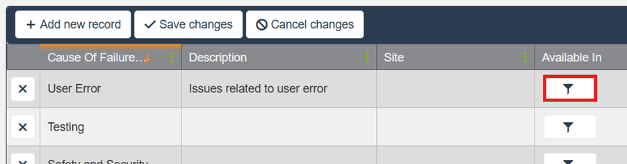 After saving, the Available In button becomes active for this Cause of Failure.