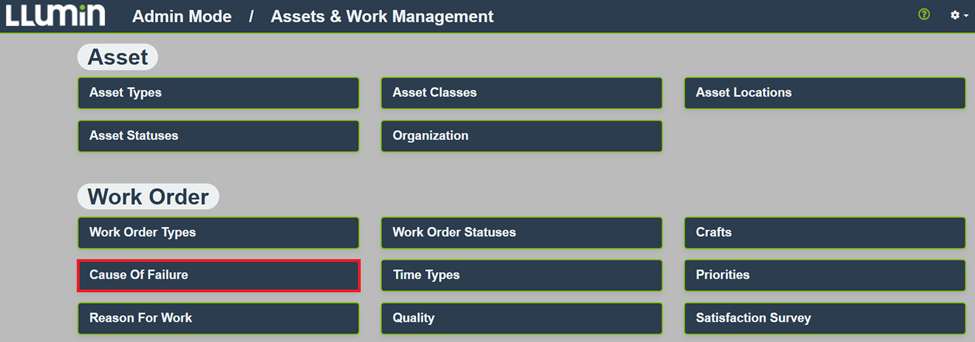 Select Asset & Work Management > Cause of Failure.