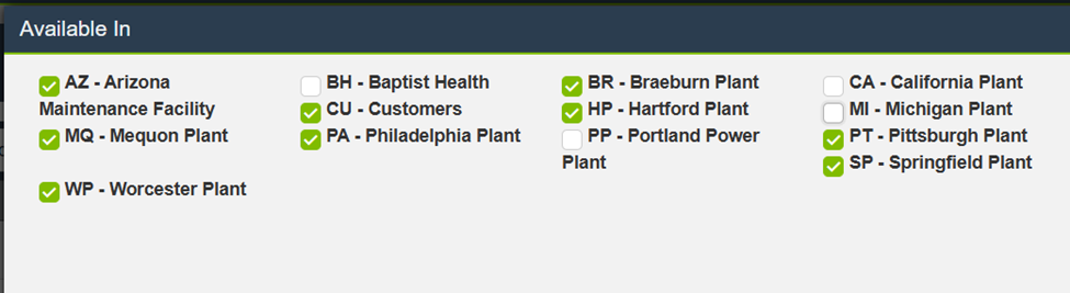 In the window that appears, check or uncheck the locations, plants, or sites where this value should be available.
