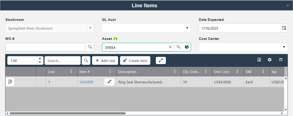 - Work Order Number, Asset, and Cost Center fields are now visible above the grid.