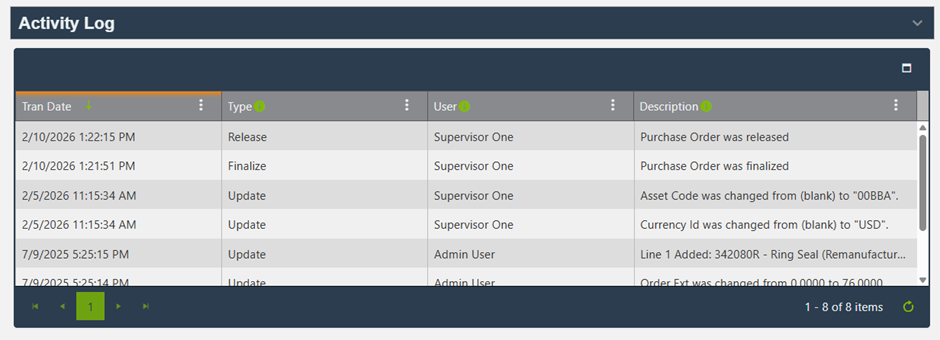 The Activity Log remains accessible within the main screen and tracks all purchase order activity.