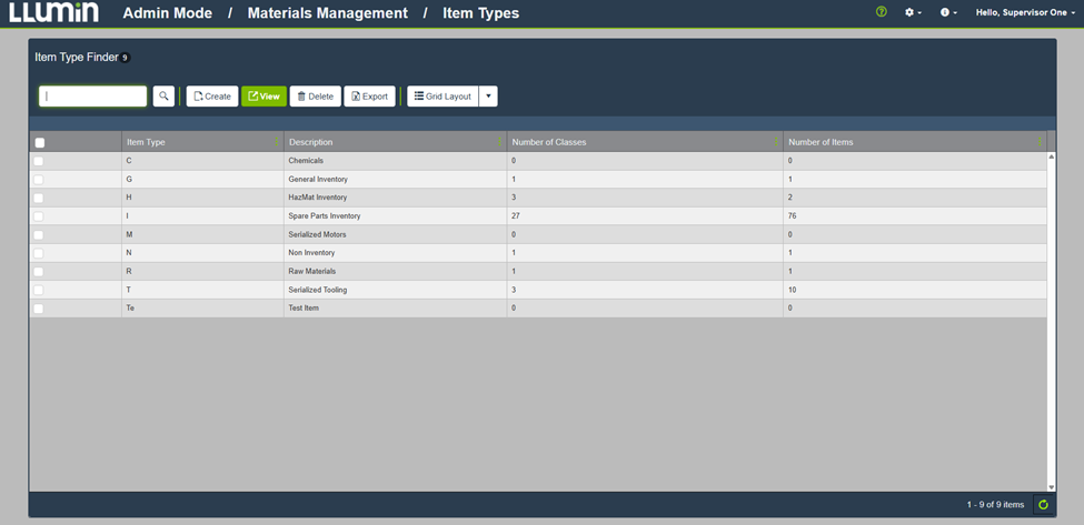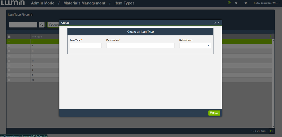 Item Types define how inventory items are categorized in LLumin CMMS+. Each Item Type controls which fields are available, required, or hidden when managing items, and can include custom validation for user-defined fields.