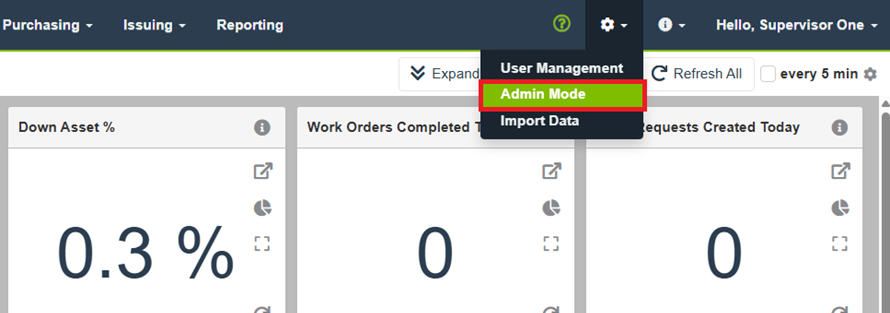 Select the Gear icon in the top navigation bar, and then select Admin Mode.
