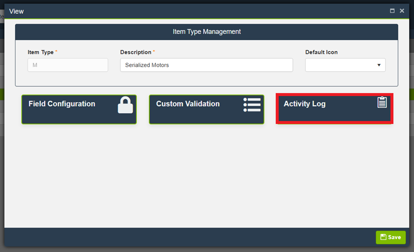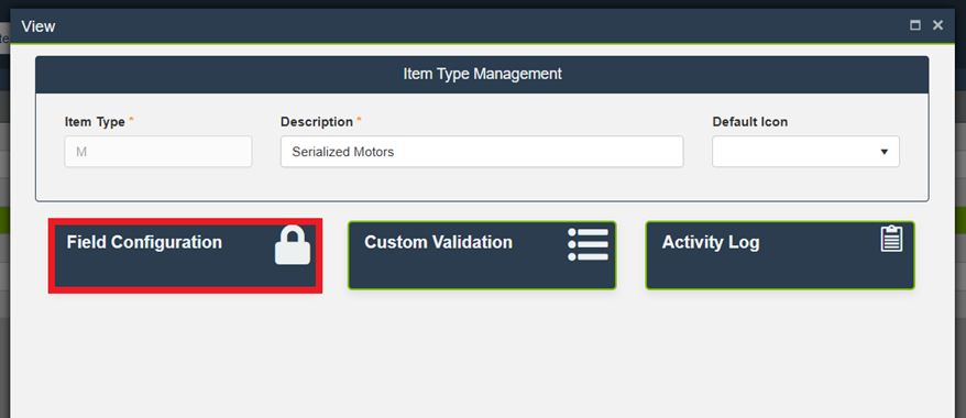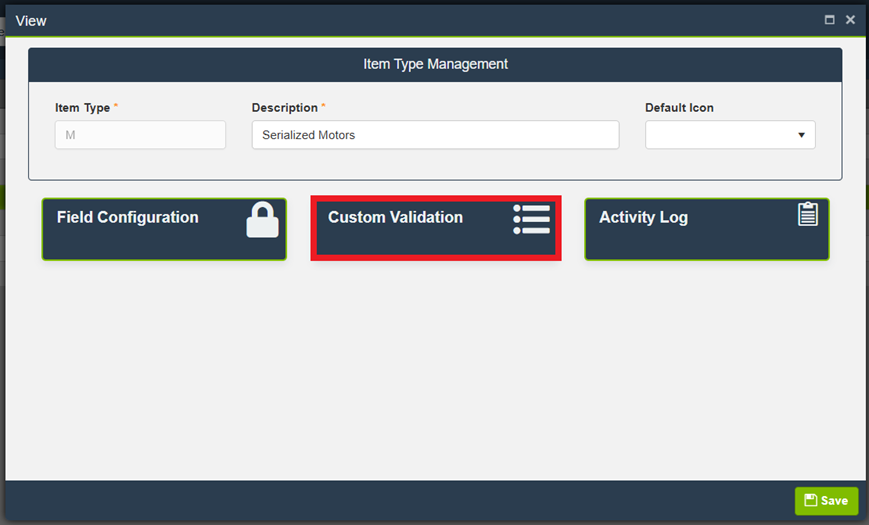 IMPORTANT: Once created, reopen the Item Type to access additional configuration cards, including Field Configuration, Custom Validation, and Activity Log.