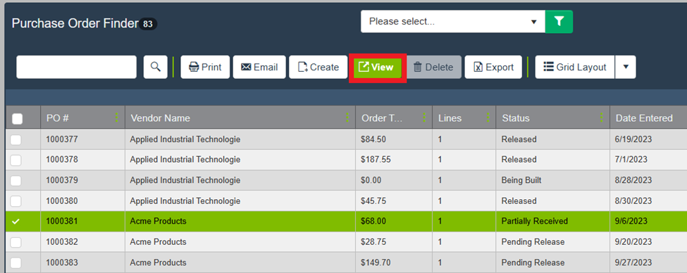Locate the purchase order you want to modify. Select it and click View to open the record.