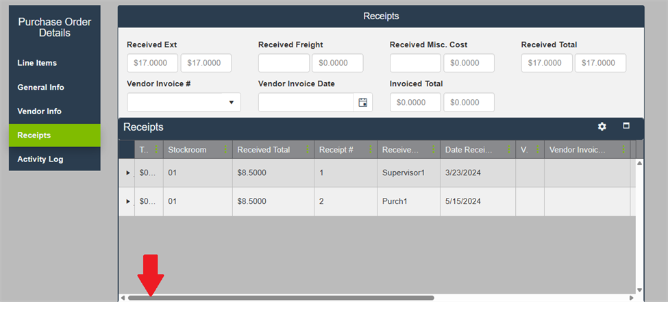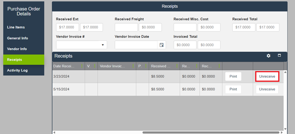 In the Receipts grid, locate the Unreceive column. Use the scroll function if you don’t see the column immediately.