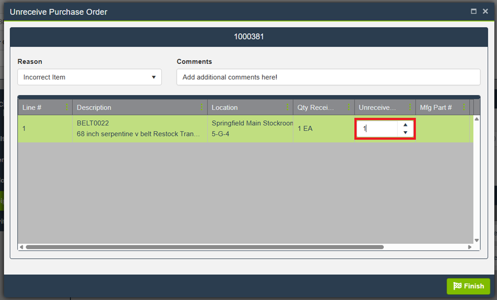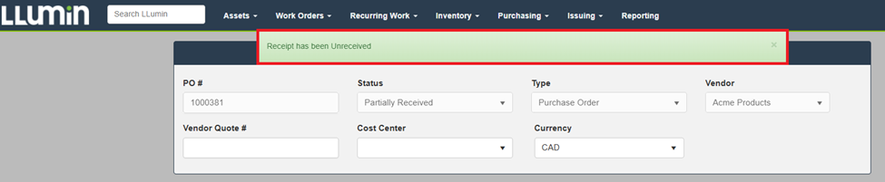 In LLumin CMMS+, you can unreceive items from a purchase order if, for example, they were received in error or need to be returned. This article will show you how to easily remove those items from your purchase orders.