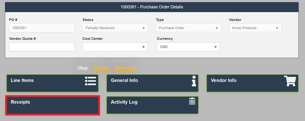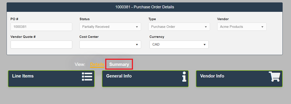 On the Purchase Order Details screen, open the Summary tab.