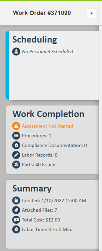 - The Cards section includes a high-level overview of the information found in the cards for Scheduling (i.e. scheduled personnel), Work Completion (i.e. Assessment Completion, Procedures, Compliance, Labor Records, and Parts Issued), and Summary (i.e. Created Date, Attached Files, Total Cost, and Total Labor Time)